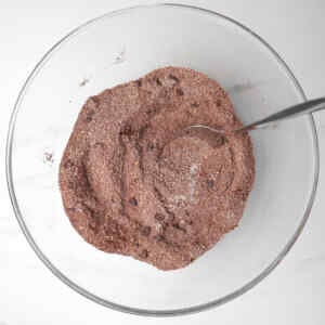 This step also helps the dry ingredients mix more evenly. Once the oat flour is combined with the cacao powder, baking powder, chocolate chips, and salt, the batter comes together smoothly when the wet ingredients are added. A whisk is enough to bring everything together without making the mixture feel heavy.