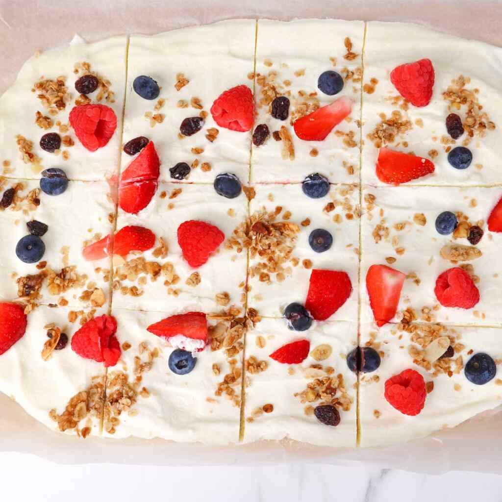 Una corteza de yogur rectangular cubierta con fresas, frambuesas, arándanos y granola, cortada en cuadritos.
