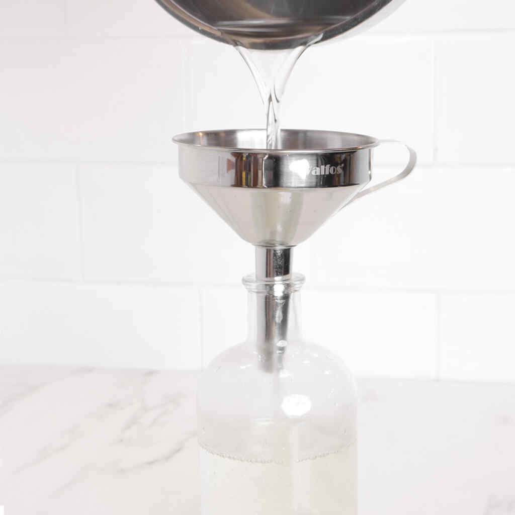 Uma garrafa de vidro cheia de xarope simples, coberta com um funil de metal.