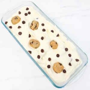 - Spoon the mixture into a loaf tin or freezer-safe container, smoothing the top. Add any reserved cookie dough pieces and chocolate chips for decoration.