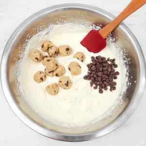 Folding is the next important step. Once the cookie dough balls and chocolate chips go in, they need to be folded through gently with a spatula. This helps keep the air in the whipped mixture. If you stir too hard, the base can lose some of that lightness. A gentle hand keeps the texture softer and more even after freezing.