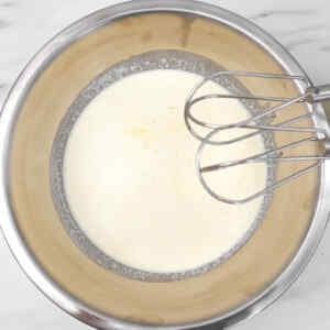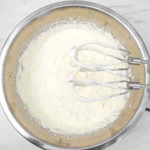 - Using an electric mixer, whisk the mixture until it thickens and forms soft peaks. The mixture should be light, airy, and hold its shape slightly.