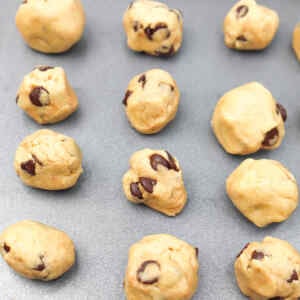 - Gently fold in the cookie dough balls and chocolate chips using a spatula, being careful not to knock out too much air. Reserve a few pieces to sprinkle on top if desired.50 Grams Dark Chocolate Chips