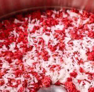 - Dip the syrup-coated rim into the coconut and raspberry mixture until evenly covered.