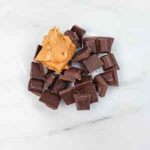 - In a heatproof bowl, melt the dark chocolate along with the additional peanut butter in short bursts in the microwave, stirring between each, until smooth.50 Grams Peanut butter, 150 Grams Dark chocolate