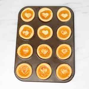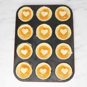 Roll out any remaining dough and use a small heart cutter (or any shape you like) to cut decorations. Place one piece of dough on top of each tart.