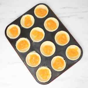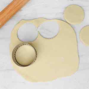 Divide the dough into two portions. On a lightly floured surface, roll out one portion at a time. Use a round cookie cutter to cut circles and gently press each one into the cupcake tin to form small tart shells.